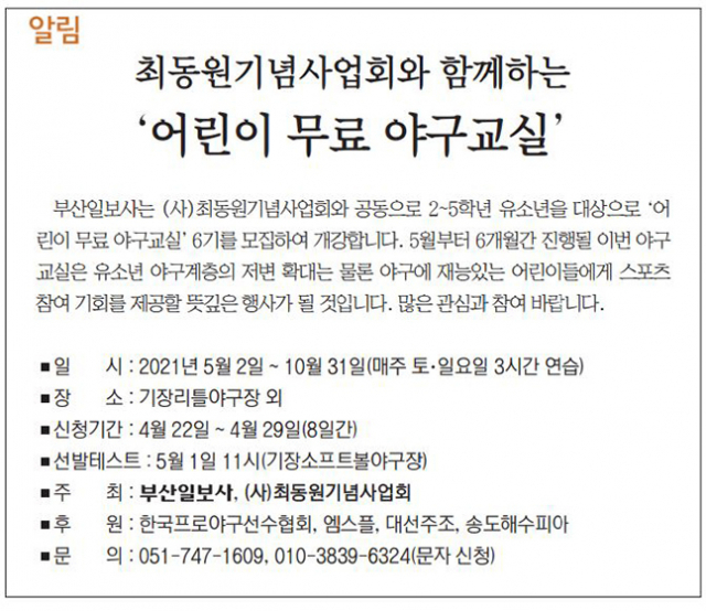 부산일보사는 (사)최동원기념사업회와 공동으로 2~5학년 유소년을 대상으로 '어린이 무료 야구교실' 6기를 모집하여 개강합니다. 5월부터 6개월간 진행될 이번 야구교실은 유소년 야구계층의 저변 확대는 물론 야구에 재능있는 어린이들에게 스포츠 참여 기회를 제공할 뜻깊은 행사가 될 것입니다. 많은 관심과 참여 바랍니다.